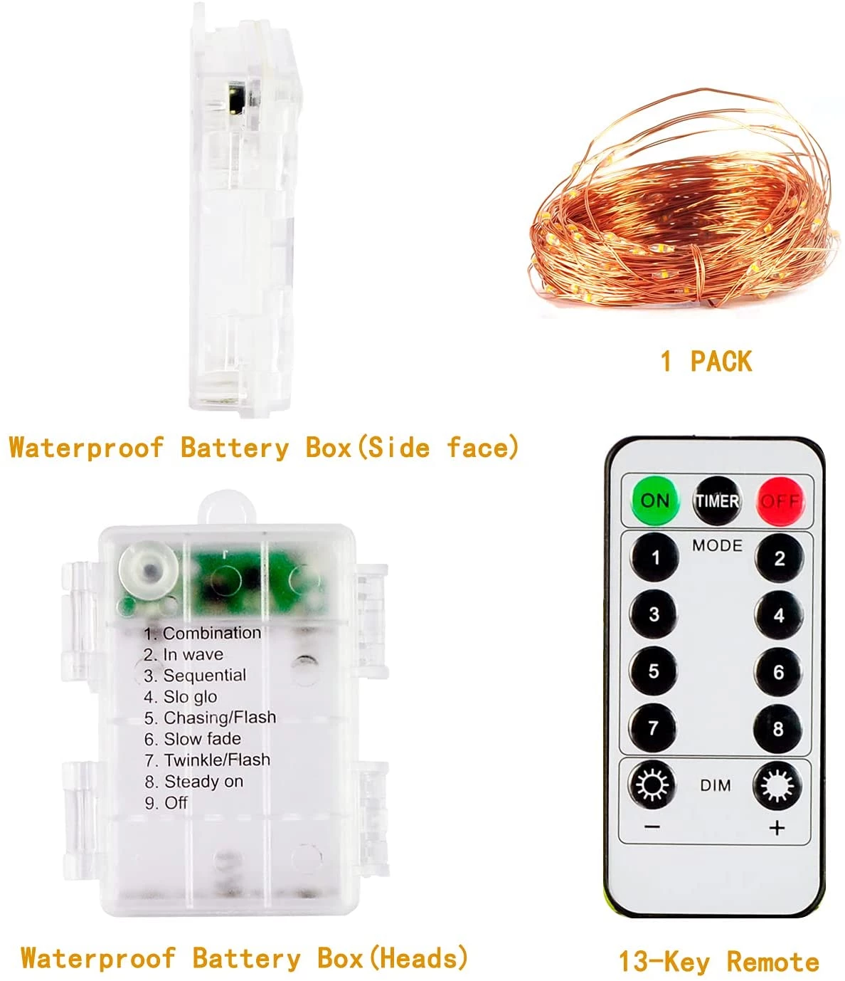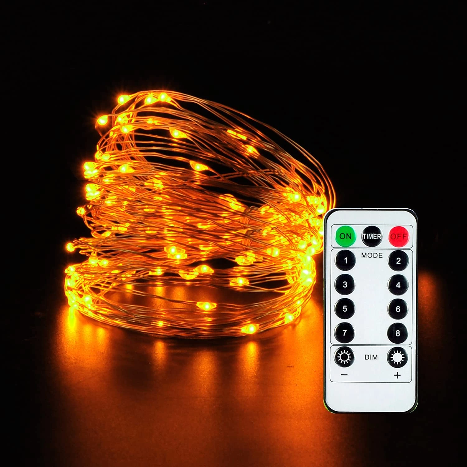- These battery-powered orange LED string lights in copper wire include 8 lighting modes and measure at 66ft. Has a total of 200 count orange light bulbs and comes with a remote contr