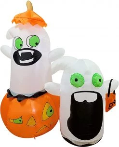- 5 feet tall cute Sneaking Naughty Ghost with Pumpkin Cap and a gift bag comes with extended cords, fastened ropes, built-in sandbags, and a plug with UL certification.