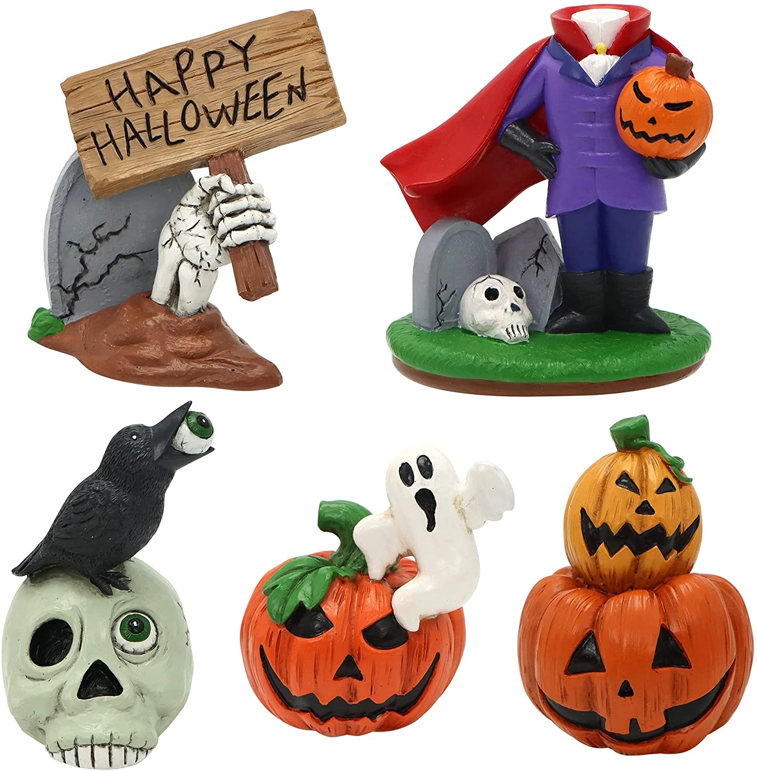 - These table top decorations are made of resin and these Halloween party decorations come in 5 individual pieces and boast a stable, well-balanced base for easy placement.