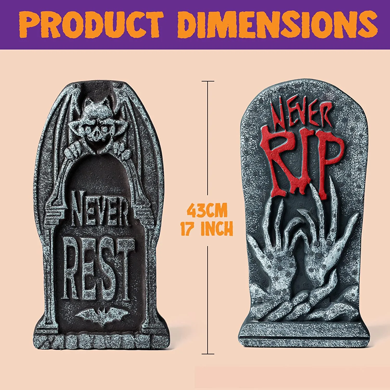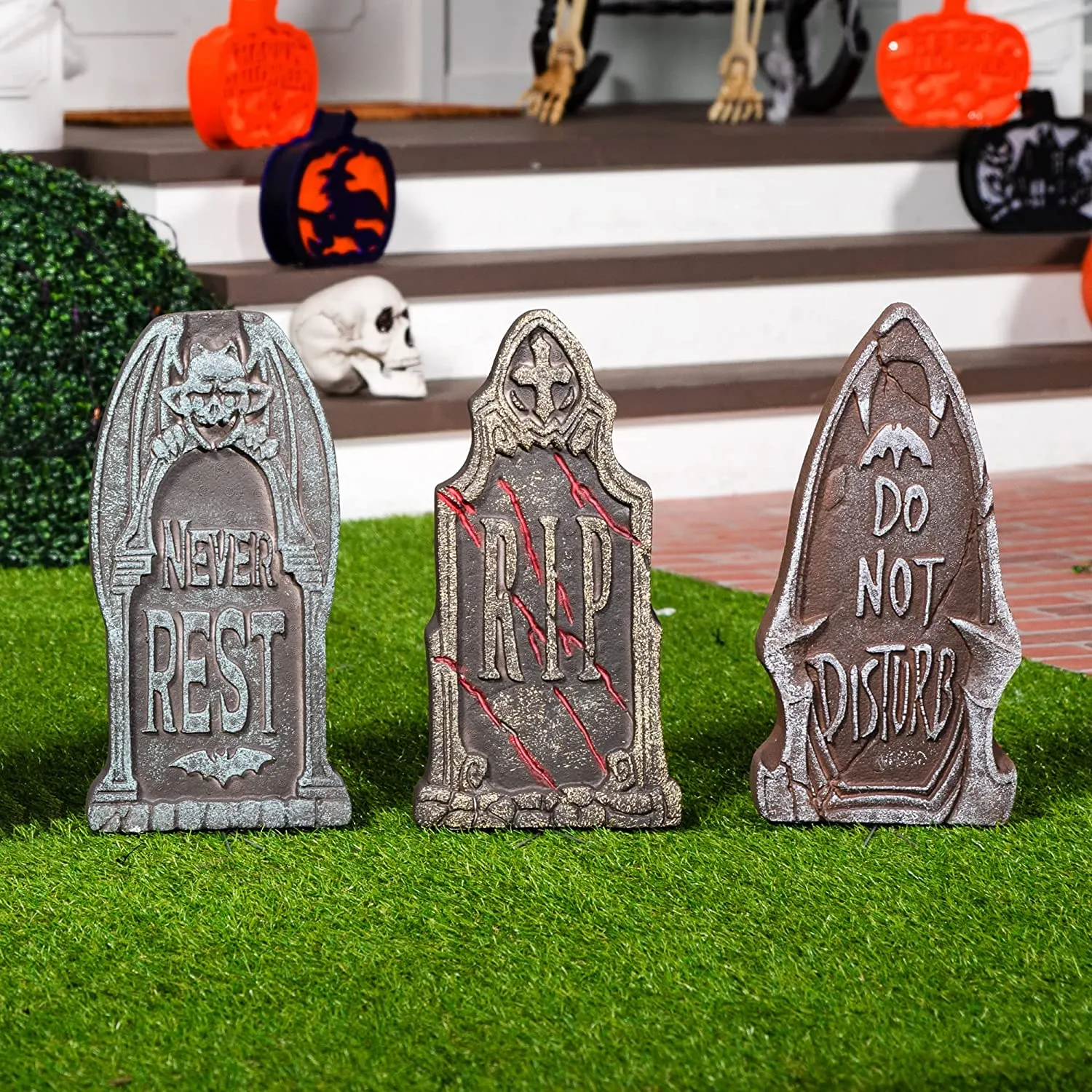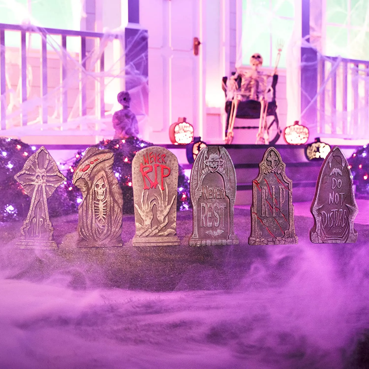 - AWESOME HALLOWEEN DECOR. Our Six 17âł Foam Graveyard Headstones and 12 Metal Stakes Halloween Outdoor Decoration gives your yard the scenario of a deadly frightening atmosphere.
