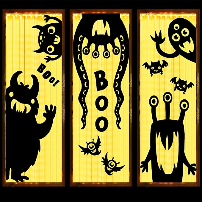 - AWESOME HALLOWEEN DECOR. Our Halloweeen window decorations include 6 sheet Halloween Window Clings. These Halloween stickers for windows have super cute Halloween themed designs – Monster.