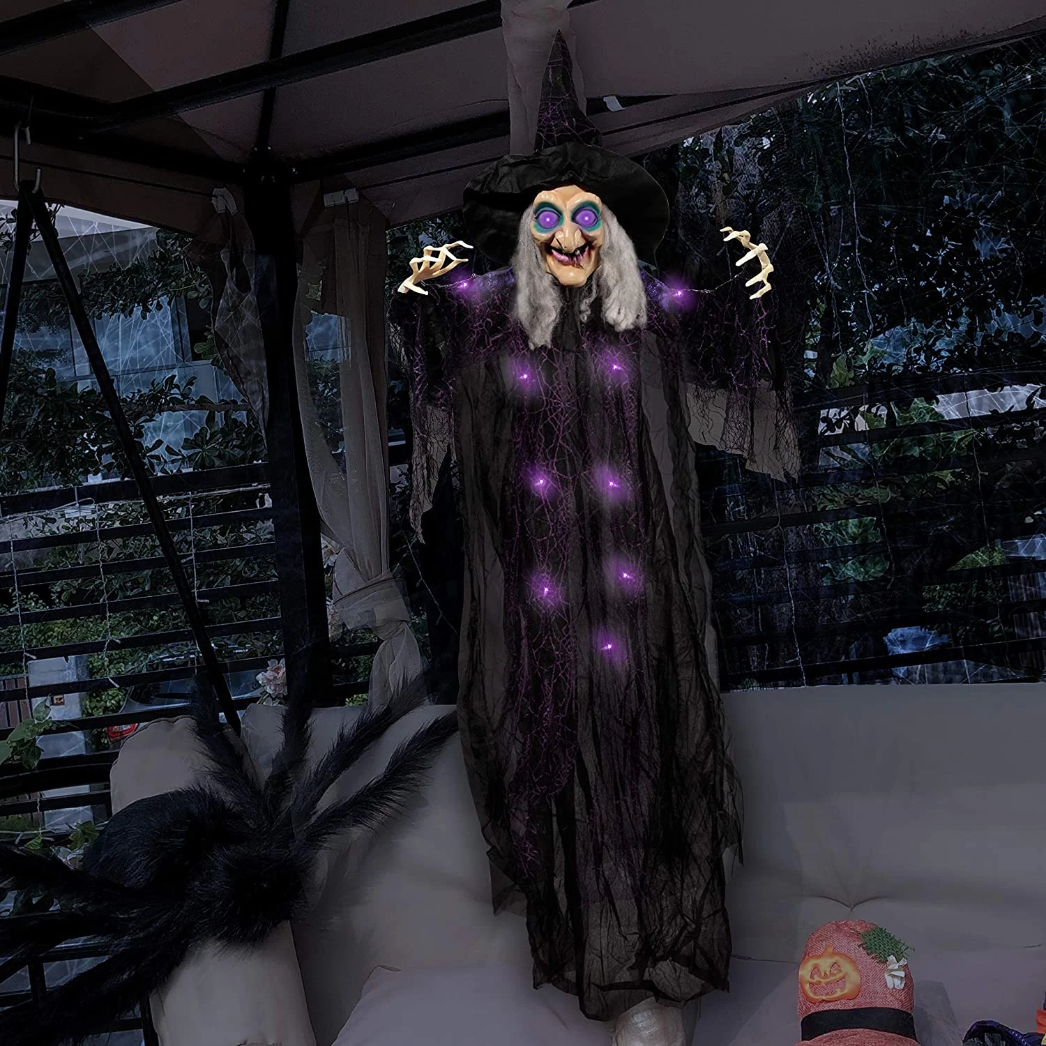 Halloween is quickly approaching, so itâs time to start planning your Hanging Witch Decoration. This hanging witch 72âł animated Halloween decoration is just what you need if youâre looking for something different and distinctive to add a spooky touch to your home, party, or haunted house. This hanging witch has a highly detailed look with an elongated head and hands, as well as poseable arms, tattered clothing, and light-up eyes to complete the look. Any sound, including footsteps, conversations, or the screams of nearby children, will cause the scary screaming to start. Sound activation is delicate and simple to start.